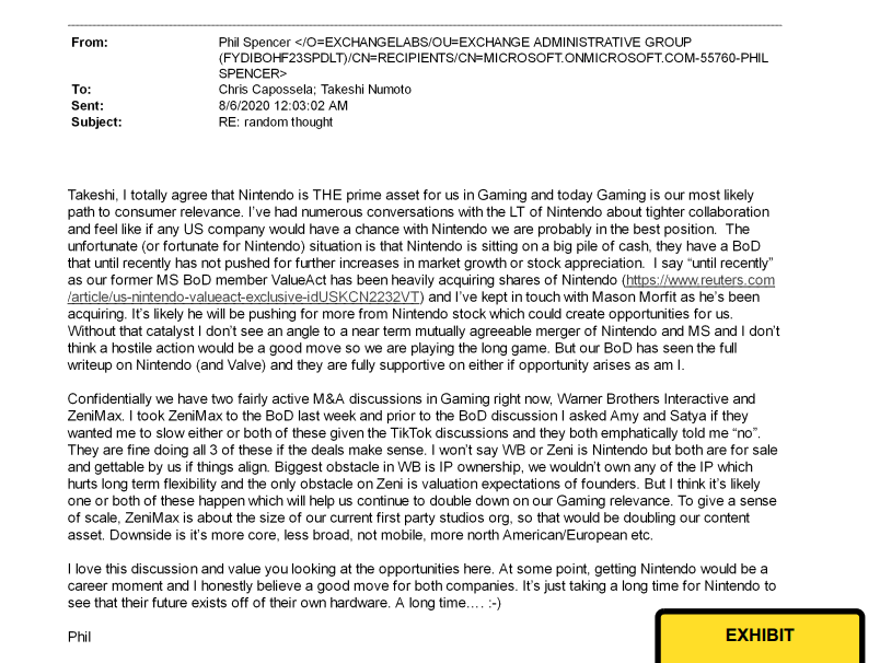 Серед злитих даних виявилися не лише презентації та папери, а й внутрішнє листування керівників ігрового підрозділу Microsoft. Так, у серпні 2020-го Філ Спенсер обговорював можливу покупку Nintendo та Valve. До переговорів зі згаданими компаніями справа не дійшла - все обмежилося лише розмовами всередині Microsoft.